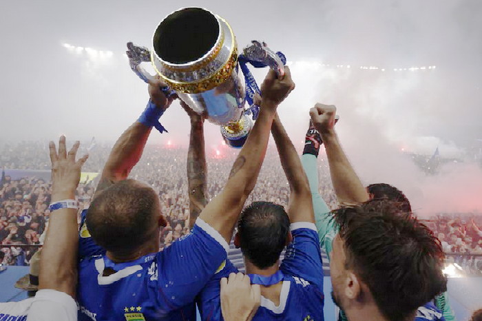 Dari empat kali meraih trofi jawara di kasta tertinggi sepakbola nasional, baru kali ini Persib mengangkat trofi di kota Bandung.