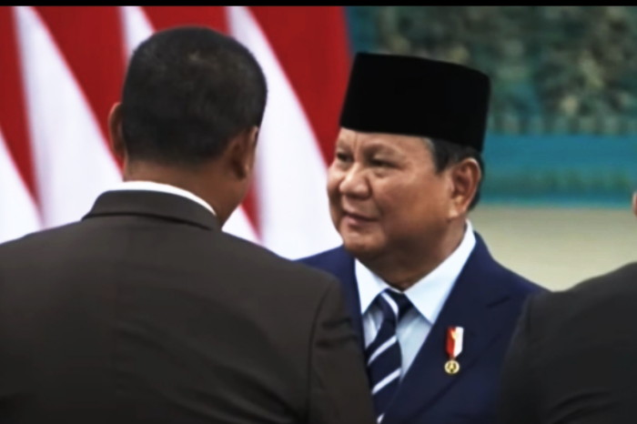 Dalam kesempatan itu, Prabowo yang hadir didampingi oleh wakilnya, Gibran Rakabuming Raka melantik para menteri baru yang berbaris diambil sumpahnya.